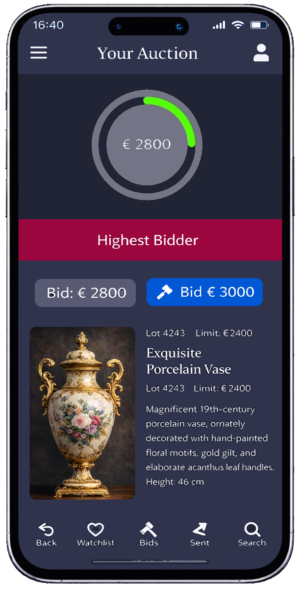 Az ön objektumlistája modern katalógusként jeleníthető meg – előnézeti képekkel, kezdőárakkal, aktuális ajánlatokkal és világos állapotjelzőkkel. Aktív aukciók esetén az ajánlatok dinamikusan frissülnek, így a licitálók bármikor láthatják, hol állnak – állandó újratöltés nélkül, zavartság nélkül.